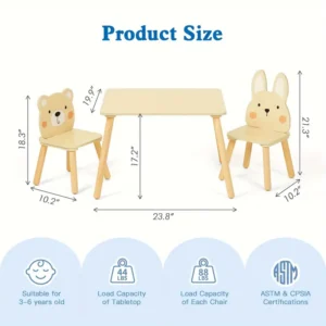 This Kids Wood Table and Chair Set is an ideal addition to any playroom or bedroom, designed for children ages 3-8. The set includes a sturdy table and two charming animal-themed chairs, perfect for playtime, arts, or study. Constructed from durable hardwood and artificial board, the paint-free, waterproof desktop withstands everyday use while remaining easy to clean. Its natural wood color and adorable design add warmth and creativity to any space, providing a comfortable and safe area for kids to learn and play without needing electricity.