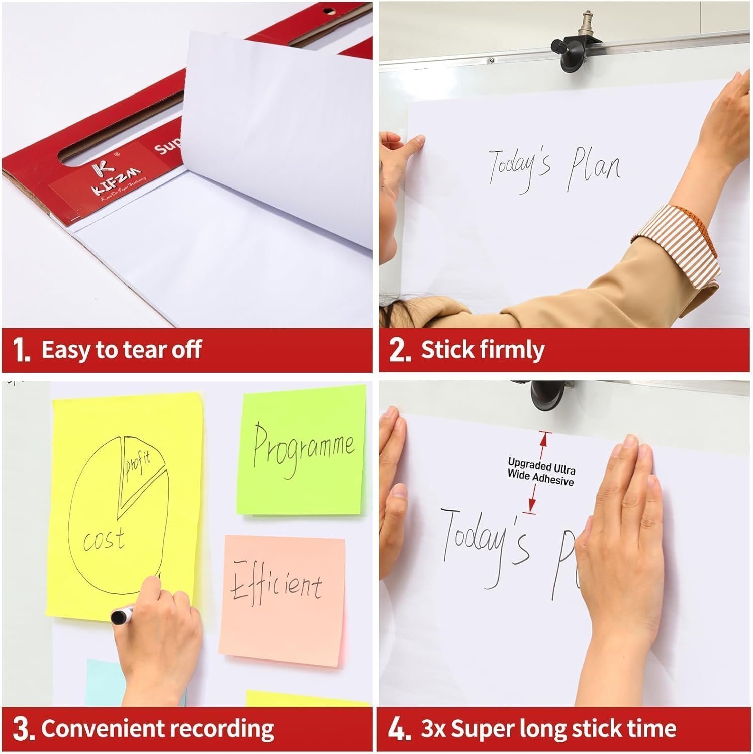 - Self-Adhesive Organization Tools in office :The presentation paper provides gaint space for meeting notes,brainstorming sessions and group activities. The self-stick function can attach to the whiteboard, keeping our ideas visible and organized