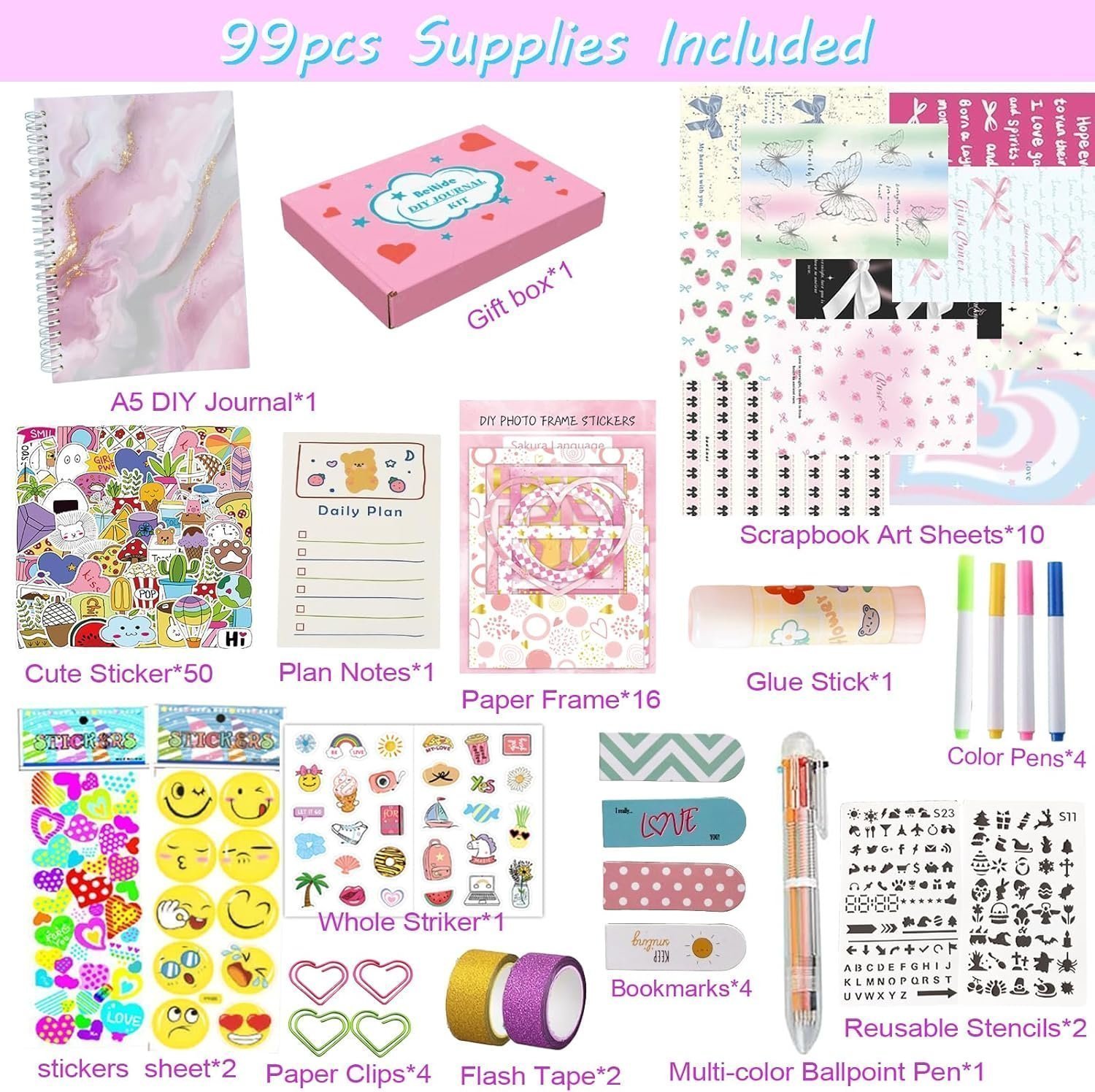 • Complete Art Kit for Girls- This DIY journal set includes everything needed for a variety of projects: A5 notebooks, 16 paper frames, 4 heart-shaped paper clips, 4 bookmarks, a glue stick, 4 watercolour pens, 1 multi-color ballpoint pen, 10 Scrapbook, 2 Decorative Tapes, 1 plan note, 2 Reusable Stencils, 2 stickers sheet, 1 Whole stickers and 50 Small Fresh Stickers, This girls gift toy set comes packed with the essentials to make your journaling dreams come true!