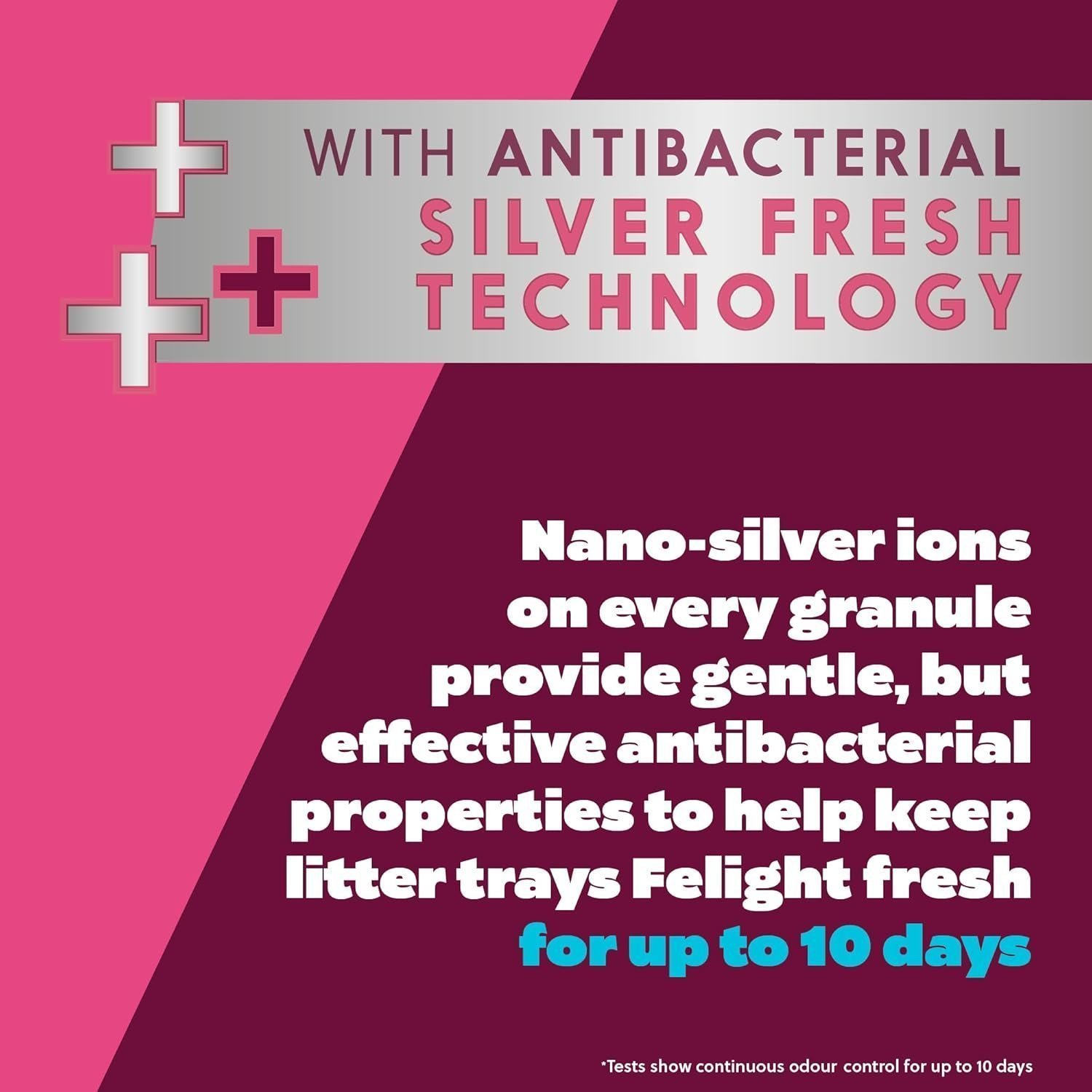 - ANTIBACTERIAL SILVERFRESH TECHNOLOGY – Nano-silver ions on every granule provide gentle, but effective antibacterial properties to help keep litter trays Felight fresh for up to 10 days