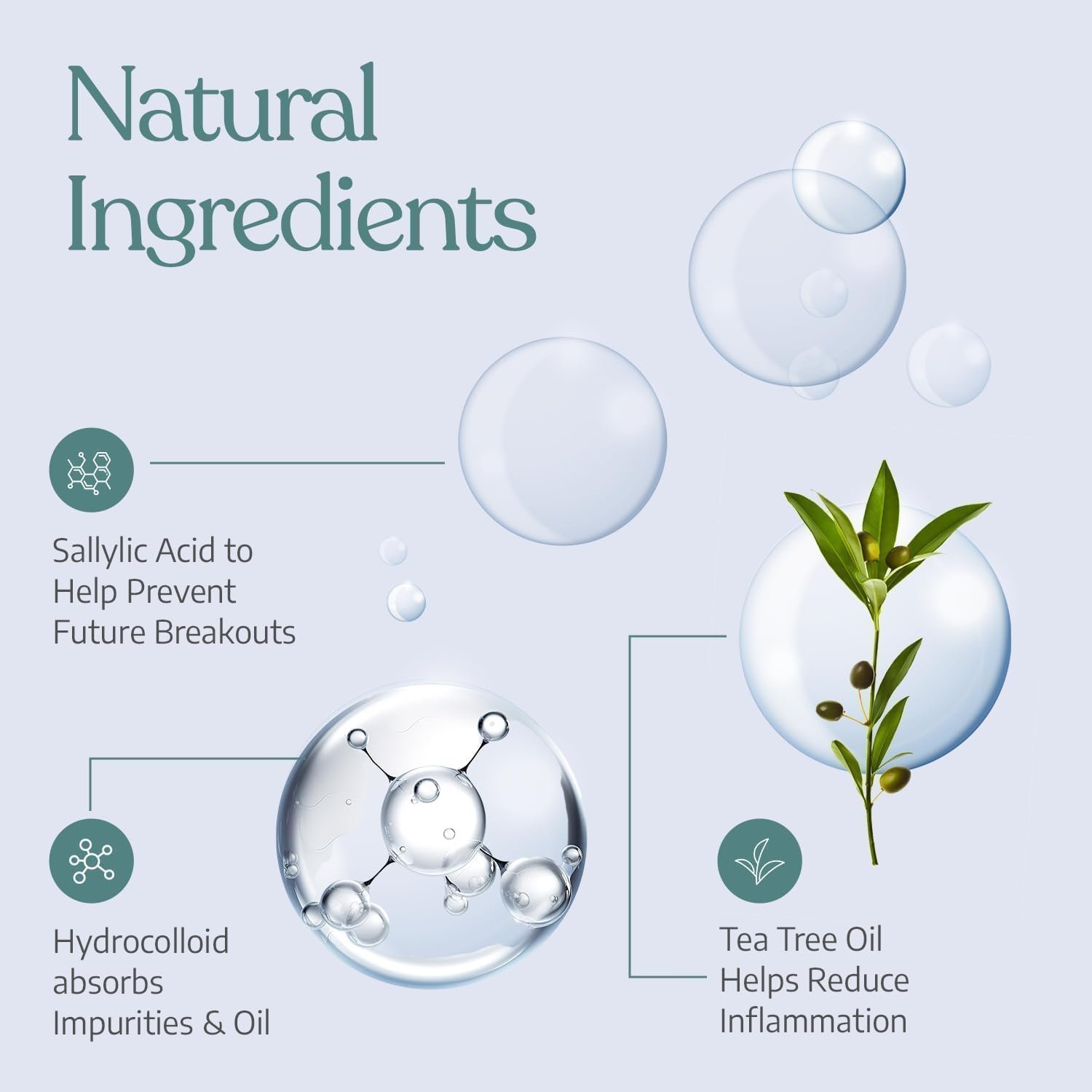 - Infused with Tea Tree Oil: Our pimple patches contain tea tree oil to gently target blemishes, reduce redness, calm inflammation, and promote faster healing. Thanks to its natural antibacterial and anti-inflammatory properties, tea tree oil can kill acne-causing bacteria and reduce swelling