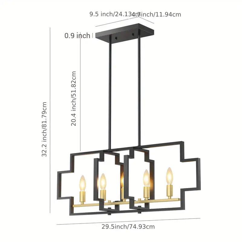 Elevate your dining space with the Restaurant Five-Light Square Dining Chandelier. This modern fixture, crafted from electroplated copper and spray-painted black metal, exudes elegance. Designed with E12 lamp holders and adjustable rods, it seamlessly adapts to various ceiling heights. The chandelier features a sleek black frame (75.5cm) and a golden frame (56cm), complemented by polished brass lamp shades. Perfect for creating an ambient dining experience, this semi-flush mount fixture includes all necessary installation hardware. Powered via hard-wired connection, it supports 110V-240V systems. Stylish, adjustable, and durable, this OTREN chandelier is a sophisticated addition to your home or restaurant décor.